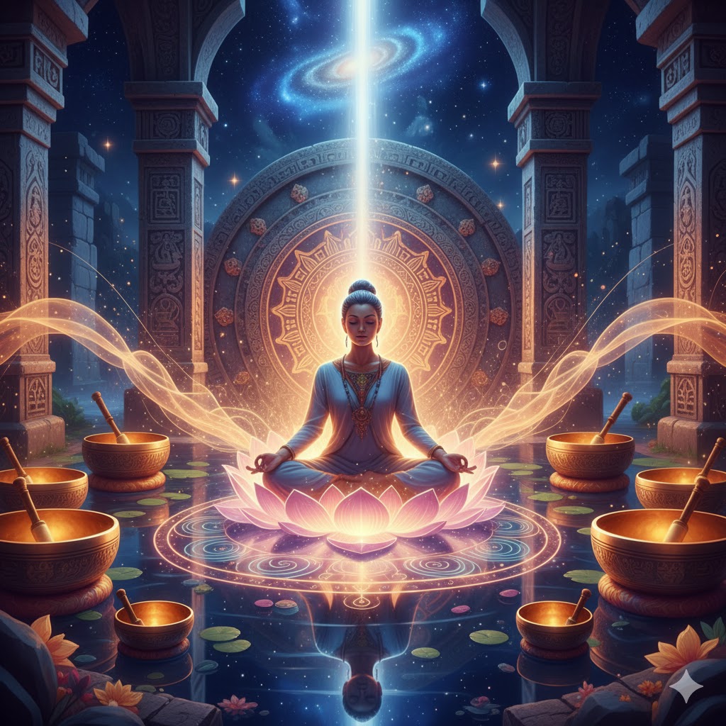 The Healing: “Imagine you are sitting inside a giant golden bowl. Every time the bowl is struck, the sound ripples through your muscles, dissolving any tension. You are not your thoughts; you are the vibration that remains.”